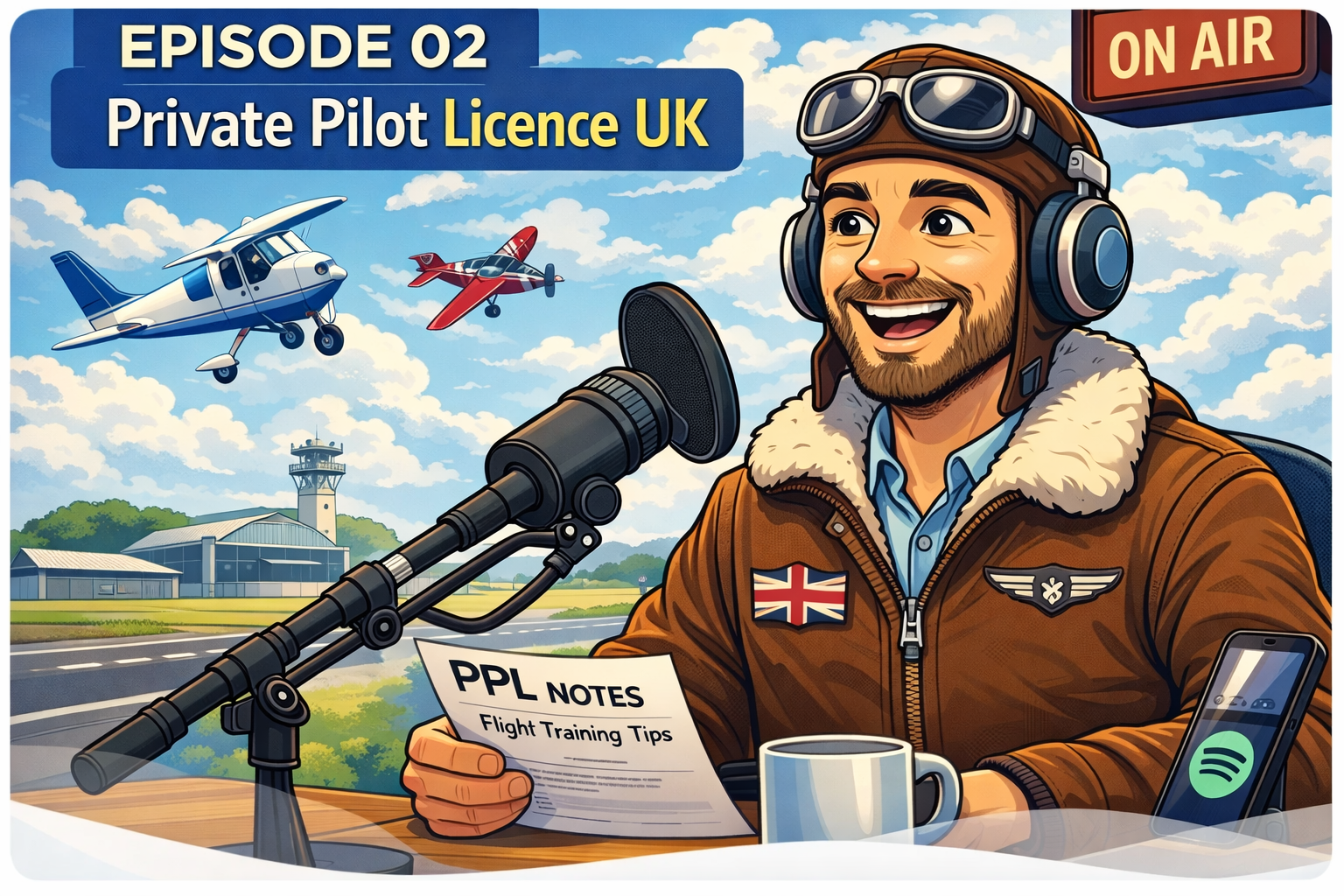 A stylised aviation podcast illustration showing a pilot host in a studio with a microphone, UK-themed flight training notes, light…